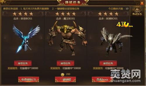43u《盛世遮天》降妖任务在230级时开启,玩家们通过点击主城npc打开界面。此处的降妖任务是击杀BOSS的任务,每天可以完成10次。降妖任务有任务等级,最高4星,星数越高奖励越丰富。