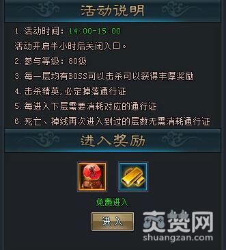 击杀混沌魔域中的BOSS可获得丰厚的奖励,奖励中包含了大量的稀有材料以及高转装备等物品。每次进入下一层需要消耗对应的通行证,而通行证则可以通过击杀地图内的精英怪获得。不过,若是角色死亡、掉线后再次进入到过的层数是无需消耗通行证的。