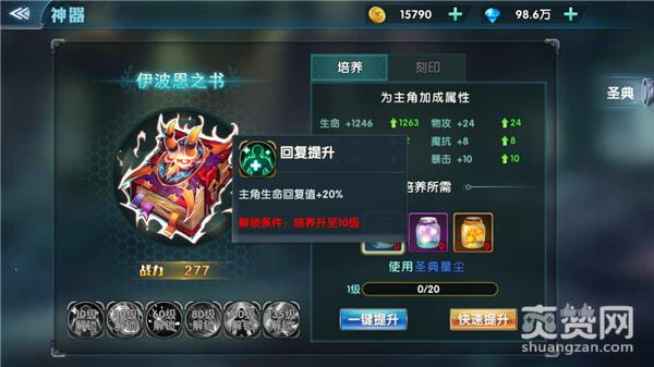 当神器的等级达到指定标准,不仅能够提供属性加成效果,还会产生额外的技能加成。这些额外的技能包括回复提升、防御提升、暴击提升、穿透提升、生命提升、攻击提升等效果。
