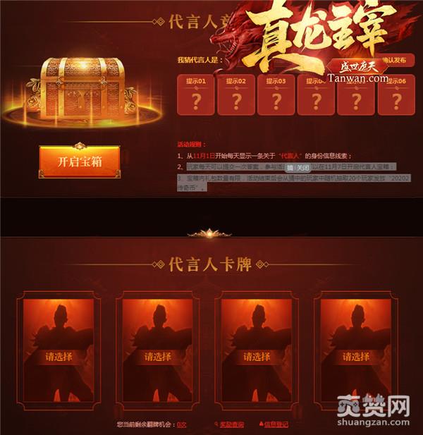《真龙主宰》开服也有一段时间了,我们特别邀请了一位男神来和玩家们共同享受游戏的快乐!猜猜他是谁呢?参与活动的玩家可以在11月7日开启代言人宝箱,活动结束后会从猜中的玩家中随机抽取20个玩家发放“20202传奇币”!代言人卡牌里还藏着海量元宝和精美实物周边,现在就来领取吧