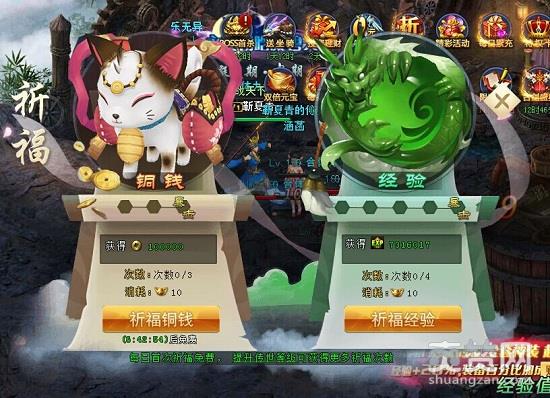 玩家祈福铜钱,可以获得铜钱奖励;而祈福经验,可以获得经验值奖励。玩家在祈福的过程中,将会随机触发暴击效果,可以获得双倍的铜钱和经验值的。玩家想拥有更多的祈福次数,可以通过提升传世等级来获得的。