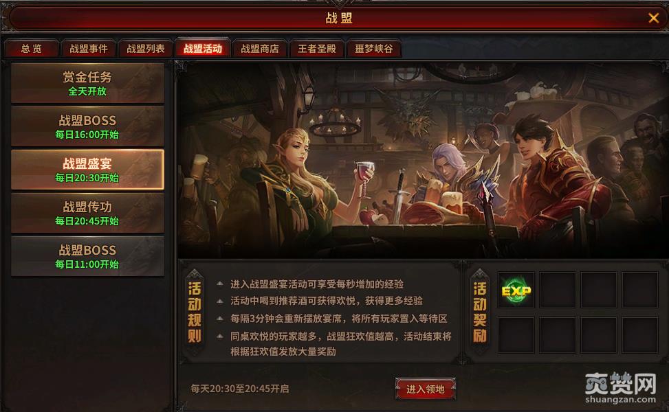 玩家加入战盟之后,每日可以参加一次战盟盛宴和一次战盟传功。战盟盛宴在每天晚上的20:30开始,持续15分钟。而战盟传功是在战盟盛宴结束后马上开始的,从20:45开始,持续时间长达数个小时,而完成他只需要1分钟。