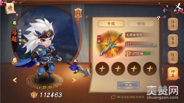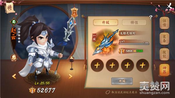 常山赵子龙,他的专属神器为龙胆亮银枪,激活后解锁超绝技龙啸长板。升段材料需要五色石与17级传说钩镰枪,拥有的特性为暴击(暴击概率)、压制(递增伤害)、免伤(减免伤害)与专注光环(全队防御提升)。
