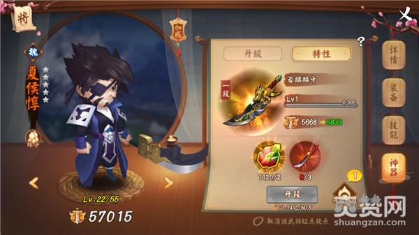 铮铮铁汉夏侯惇,他的专属神器为若麒麟牙,激活后解锁超绝技苍狼啸月。升段材料需要五色石与16级传说锯齿刀。拥有的特性为血战(伤害递增)、暴击(暴击概率)、反伤(反弹伤害)、战歌光环(全队攻击提升)。