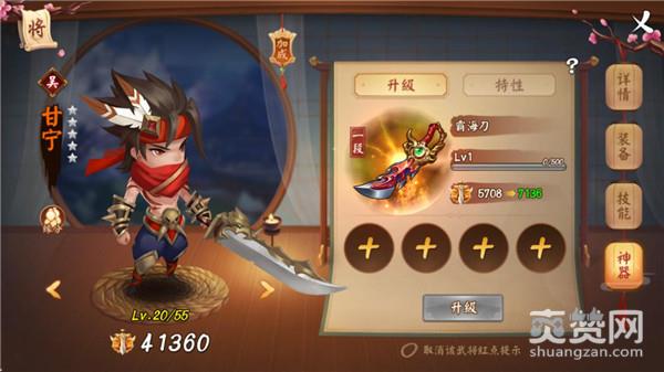 骁勇战士甘宁,他的专属神器为霸海刀,激活后可解锁超绝技锦帆龙舞。升段材料为五色石与16级传说锯齿刀,拥有的特性为暴击(暴击概率)、武威(伤害递增)、免伤(减免伤害)、急速光环(全队速度提升)。
