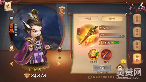 说曹操就到的曹操,他的专属神器为倚天剑,激活后可解锁超绝技号令天下。升段材料为五色石与16级传说华锋剑,拥有的特性为武威(递增伤害)、斩杀(残血秒杀)、坚壁(提升防御)、急速光环(提升全队速度)。