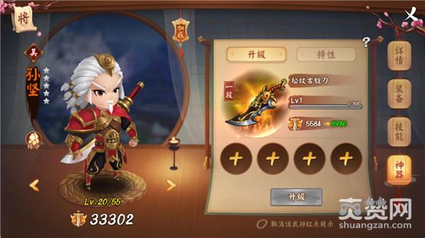 老当益壮的孙坚,他的专属神器为松纹古锭刀,激活后可解锁超绝技石破天惊。升段材料为五色石与16级传说锯齿刀,拥有的特性为压制(递增伤害)、暴击(暴击概率)、坚壁(提升防御)、回春(生命回复)。