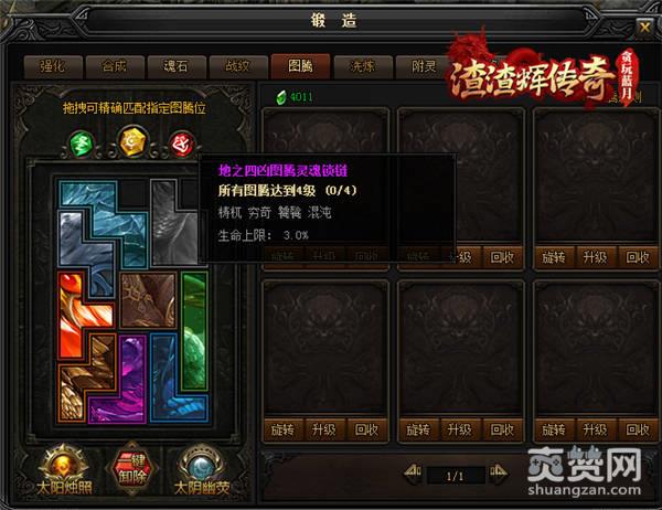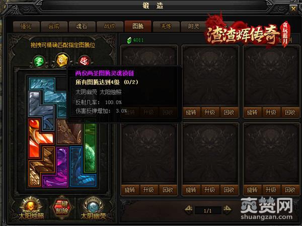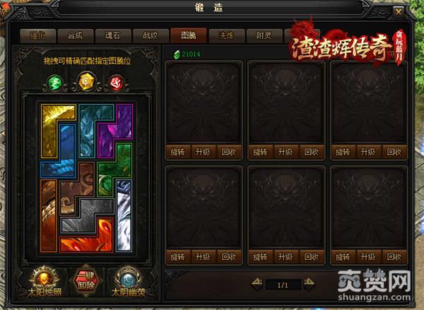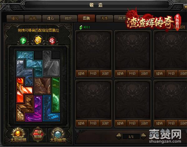 太阳烛照,获取的方式有,用四大神兽的图腾,青龙,白虎,朱雀,玄武,来进行打造合成,太阴幽荧,获取的方式有,用四大凶兽的图腾来进行激活打造,梼杌,穷奇,饕餮,混沌,这四大凶兽的图腾,合成出来的也是随机的,伤害,图腾格式也都是不一样的,那么好了,图腾就到这里,当获得这十大图腾的时候,我们要根据自身情况去把他们全部拼凑起来,打造成一个完美的图腾,可以根据获得不同类型的图腾进行拼凑的,多的图腾进行回收获得图腾精华来升级,当拼凑出来的图腾,拼满这个图腾,相信,你基本已经在《渣渣辉传奇》这款游戏里面霸主一方了。