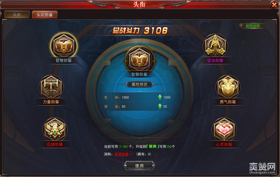 头衔徽章一共有6个,由低到高依次是:智慧徽章、坚决徽章、力量徽章、勇气徽章、迅捷徽章和心灵徽章。徽章的获取可以通过副本冥河之战和合成获得,智慧徽章合成需要消耗智慧徽章碎片,坚决徽章合成需要智慧徽章,合成规则按照由低到高依次进行材料都是前一个等级的。