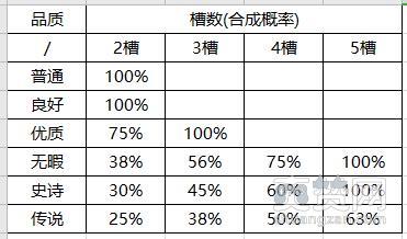 老玩家都知道,通常只需要2槽就能使普通品质与良好品质的装备达到100%的合成概率。那么如果想制造更高品质的装备,这概率又会是多少呢?为了得到答案,小编进行了上百试验,终于找到其中的规律,优质品质的装备需要3槽可达到100%概率,无暇与史诗品质的装备都需要5槽,而传说级装备则无法依靠槽数叠加来实现100%的概率。另外,以上得出的结论只针对与同件装备而言。