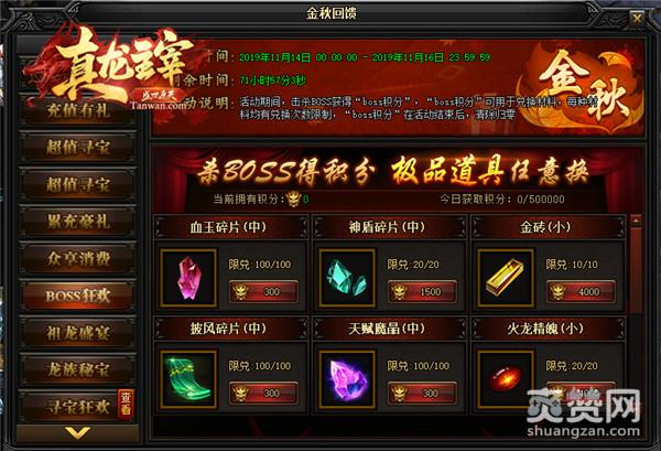 和丹哥一起打boss,你躺好就行!击杀击杀BOSS获得“boss积分”,“boss积分”可用于兑换材料,火龙精魄、金砖等等各种高级道具应有尽有!