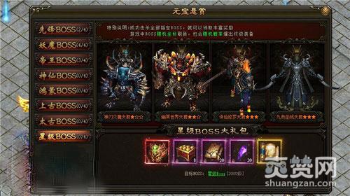 元宝悬赏里除了有九劫圣战天君之外,其他刷新出来的boss都有几率爆出紫装和红装,要是击杀的boss够数量了也可以得到boss礼包,里面有高阶头盔一件,海量元宝、天书残片、印记残片,绝对是您不能够错过的。
