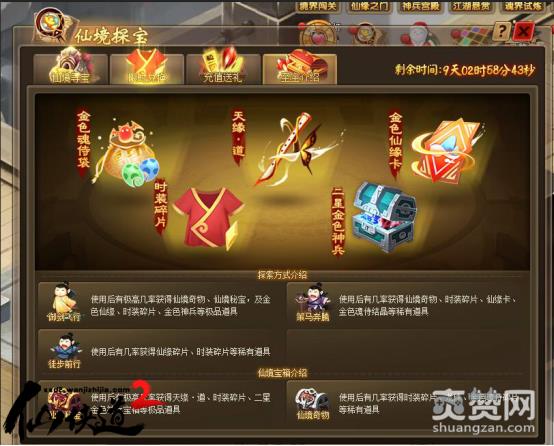 在玩机之家《仙侠道2》中,仙境探宝活动分仙境寻宝、限时兑换、充值送礼和至宝介绍四个模块!在仙境探宝活动中将有机会获得幻生及时光奇遇时装,冰月元婴、金色魂侍袋,二星金色神兵宝箱,金色仙缘卡等极品奖励。仙境寻宝地图分为6个等级,依次为仙境蓬莱、神山方丈、仙山瀛洲、洞府青城、天柱昆仑、仙宫沧海,所有地图每日零点重置。大侠们可通过徒步前行、策马奔腾、御剑飞行3种不同的方式探索仙境地图,而且每日会赠送10次徒步前行哦。探索过程中,将掉落物品,探索方式越好,藏宝图掉落物品越好,每探索完一张地图,将获得对应的地图目标奖励呢。