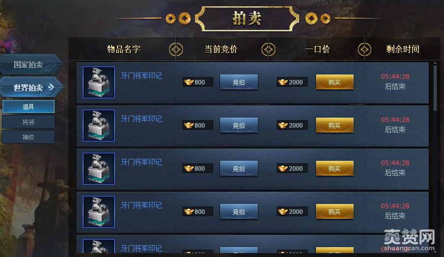 官印提升需要使用印记,在【拍卖】系统中,玩家可以使用元宝来购买各种印记。左侧记录了国家拍卖以及世界拍卖的物品,世界拍卖点击道具一项,就会展现出不同的印记,价格分为“当前竞价”和“一口价”,当前竞价售价较低,可尝试购入,一口价的价格有时候是竞价的一倍之多,所以建议玩家尝试竞价后再购买。玩家根据左侧名称找出自己需要使用的官印材料购买即可,购买后到官印系统中就可以使用了。