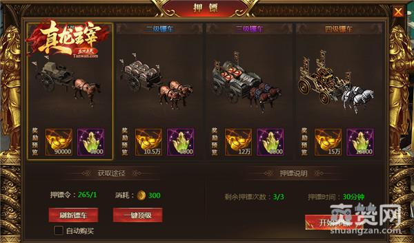 镖车分为4个等级,每个等级的镖车奖励是不一样的,可以通过使用押镖令来刷新镖车等级,也可以直接使用300传奇币直接到达顶级镖车。