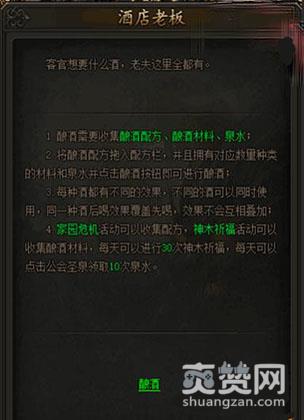 酿造成功可以获得不同的酒,不同酒有不同属性加成,不同的酒使用效果可以叠加,同一种酒效果后喝覆盖先喝,酿酒配方通过参与家园危机活动获得,酿酒材料通过神木祈福活动获得,泉水通过公会圣泉活动获得。
