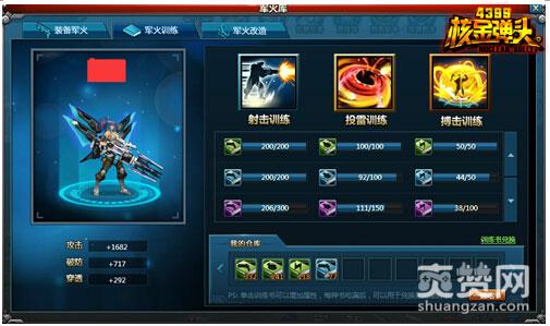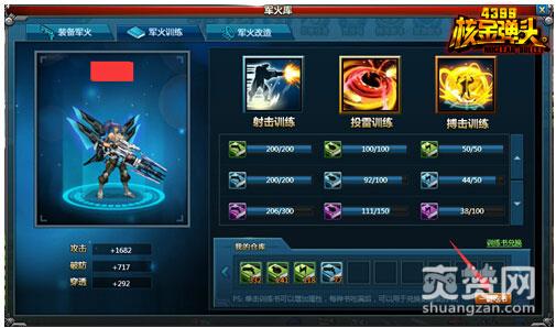这里是能提升大量攻击、破防、穿透属性的地方,分别有射击训练、投雷训练、搏击训练,对应的材料依次需要初级射击(投雷、搏击、)训练书、中级射击(投雷、搏击)训练书、高级射击(投雷、搏击)训练书、超级射击(投雷、搏击)训练书、终级射击(投雷、搏击)训练书、究级射击(投雷、搏击)训练书,需要从初级开始训练,当初级训练满级以后,依次开始中级、高级、超级、终极、究级训练,可在“我的仓库”里看到当前的训练书,点击一键吃书,就可以进行。
