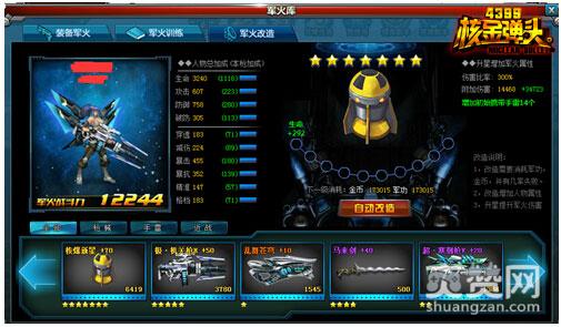 点击自动改造,就可以进行操作。改造会消耗一定的金币和军功,系统会自动显示下一次需要消耗的金币和军功。改造会有一定几率失败。每改造成功一次,军火等级就加一级,当一轮全部改造成功后,可以给当前的武器进行升星,直接点击升星,升星必定成功,升星可以给军火带来额外的附加伤害和伤害比率。每升一星,枪支上面就会显示一个五角星。升星不需要消耗金币和军功。然后可以进行下一轮的改造、升星,星级越高,武器威力就越大。