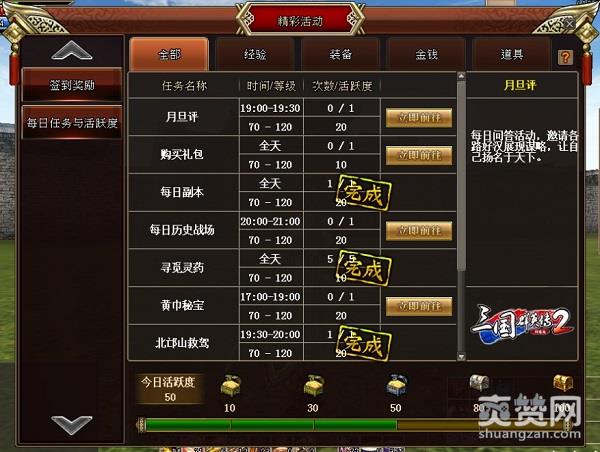 1.活跃度系统开启后,玩家可以根据自己的需求快速找到对应的日常活动,不管是想要经验、金钱还是急缺装备,道具,都可以轻松在分类中找到相应的活动,满足需求就是这么简单!