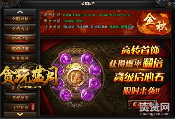 《贪玩蓝月》超值寻宝开启,活动期间高转武器、首饰概率翻倍!更有超强宝石,高级启心石限时掉落,备战巅峰赛季必不可少!寻宝次数达到指定次数可转动秘宝,极品道具准备好了。