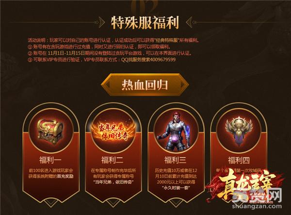 怎样才可以参加特殊服呢?首先玩家可以对自己的账号进行认证,认证成功后可以获得"经典特殊服"所有福利。如果账号有在贪玩游戏进行过充值,同时又进行回归认证,即可以领取福利。当然,账号在 11月1日-11月15日期间没有登陆过贪玩平台游戏,可以在本界面进行认证。那有什么福利呢?福利那可就多了!毕竟是是对老玩家开放的,所以我们也是诚意满满的呢。第一波只要你挤进了前100名进入游戏玩家会获得系统附赠的首充奖励哦,每个人还可以拥有情怀称号哦,“当年兄弟,依旧传奇”这个称号听起来就很热血满满呢。还有专属的“永久时装”和专属的定制称号呢。想要了解更多福利,点击活动链接吧。
