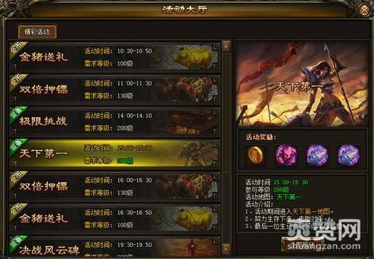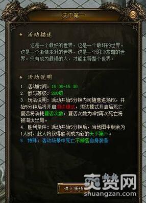923yx《灭神》中的天下第一活动在每天的15:00-15:30开启,当大家等级达到200级后即可通过圣妖城NPC(149,50)进入活动界面。在活动开始5分钟内,大家可以随意进场PK,开始5分钟后将开启淘汰模式。