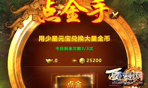 每天可免费点金一次,后续花费少量的元宝即可再次点金,每天总共点金次数只有三次;点金会机率出现暴击,大家伙,拼人品的时候到咯~