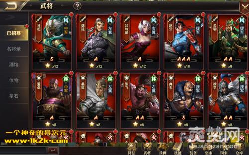 武将入口:玩家可通过主界面中的武将按钮进入武将功能系统,使用将魂和对应品质的星石可以对武将进行升星培养,消耗拜访礼物可以培养武将对应的成长属性。这里展示了玩家已拥有的武将信物。 注:若玩家已拥有某武将,在之后继续获得该武将信物时会自动将信物分解为对应品质的星石。这里展示了玩家拥有的星石数量,同时玩家可以通过合成和分解功能将高、低品质的星石进行相互转化。