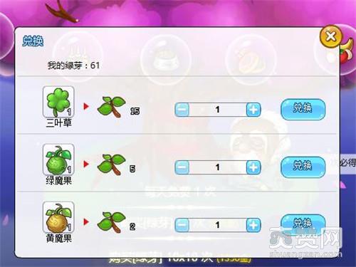其中,“三叶草”属于讨好道具,被使用后能够增加100游戏积分;绿魔果属于讨好道具,被使用后能够增加1-20游戏积分;黄魔果和绿魔果非常类似,被使用后能够增加1-6游戏积分。当然,通过使用“绿芽”进行兑换的道具依然可以进行交易和回收,具体价格建议各位在游戏中查看。特别注意的是,如果你想要获得“三叶草”礼物之星,就不得不先使用“绿芽”兑换三叶草哦!