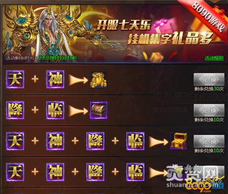 全名boss,击杀对应条件的BOSS,领取档位奖励;开服前7天集字兑奖收集天神降临四个字,换取对应奖励;每天会有一个主题活动,分多个目标档位玩家达成档位可领奖。