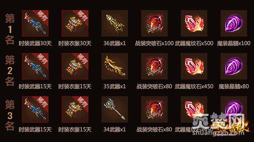 12月10日-12月16日期间,游戏内推出极限冲榜活动,符合条件的玩家即可进入榜单排名,榜单实时刷新,最终站上榜单的前10名玩家可受到全服玩家的瞻仰。榜上有名不仅收获荣誉,更可以收获无上至宝——36阶武器鸿卍蒙〃重黎灬梵天☆剑,堪称《热血战歌创世》内的绝世神兵,也是大神玩家的实力象征。究竟是哪位大神实力全开榜摘得桂冠,让我们拭目以待!