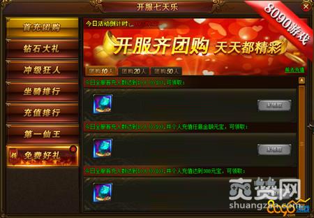 开服前7天,首充团购,首充达到一定人数,就可以领取大奖;激活相应的钻石即可获得额外奖励;开服第1-3天,充值排行。第一仙王。