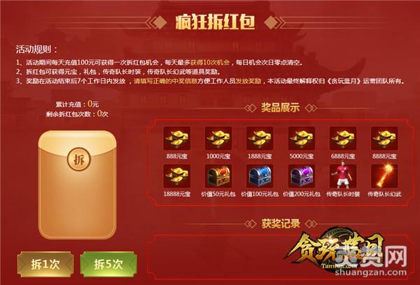 在活动期间每天充值100元可获得一次拆红包机会,每天最多获得10次机会,每日机会次日零点清空。拆红包可获得元宝,礼包,传奇队长时装,传奇队长幻武等道具奖励。