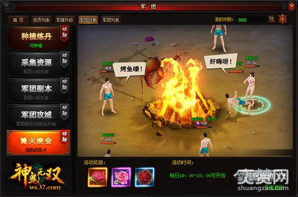 37《神鬼无双》篝火晚会在每晚19:00-23:00期间,由军团官员自主开启。活动过程中,玩家可进行烤鱼,根据鱼类的不同,完成烤鱼后获得相应的经验。别小看这小小的烤鱼,这些鱼都是玩家在军团活动中自己垂钓得来,与亲密的人分享自己的劳动成果,幸福也不过如此了吧!