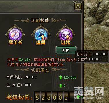 诅咒和虚弱技能升级玩家可以在切割界面的第一个标签切割出进行升级,技能升级需要消耗大量的元宝和创世币,每次升级切割等级+1,在配合满价切割和虚弱技能,即可是洪荒和鸿蒙boss进入虚弱状态。