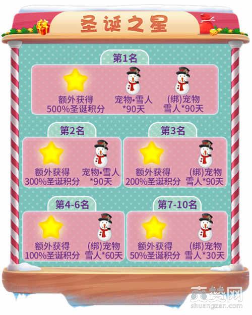 活动结束后,所有玩家的“圣诞积分”会全部转换为游戏积分。获得“圣诞积分”最多的前十位玩家,将能够获得“圣诞之星”奖励: