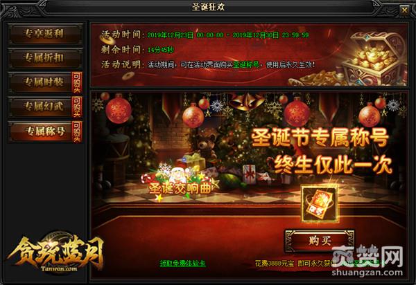 我们经常看到一位游戏角色,往往就是他身穿的装备,第二就是他的专属称号了。所以,这次《贪玩蓝月》给大家准备了“圣诞交响曲”称号哦。带上这个头衔,你就是圣诞节最帅的仔。更有累计充值1000元宝,返利比例最高可达50%的“专享返利”活动。同时,将开放大量珍贵物品的售卖,超低折扣盛情回馈的专属折扣活动。