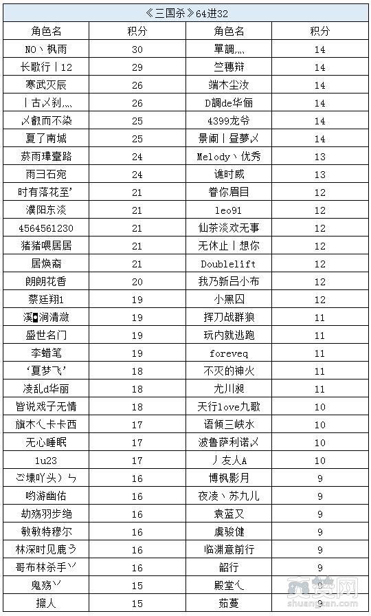 1月4日-5日,《三国杀》将进行的是第二届身份争霸赛64进32的比赛。以下是64强名单: