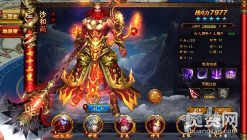 通过43u《萌宠西游》主界面底部的“72变”图标,大家即可进入72变系统界面。在72变系统界面中,大家可查看各个变身。界面左侧分为天罡变和地煞变两个页签,不同的变身增加的属性特点不同,主、被动技能,天赋各有特色,可应对不同的场合。