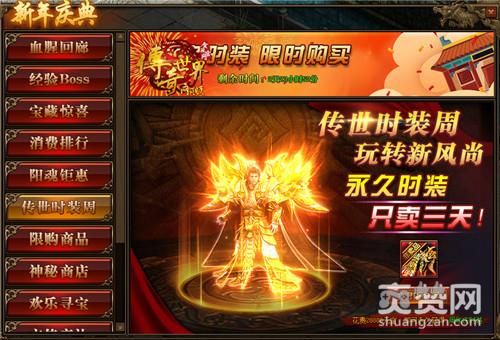新年新气象!怎么换新气象?那就是换一套金光闪闪的服装啦,走到街上,闪瞎路人眼睛,你就是《传奇世界网页版》的主角!在活动期间,传世时装周,玩转新风尚,还是永久时装哦,但是只卖三天,所以大家捉紧时间吧!