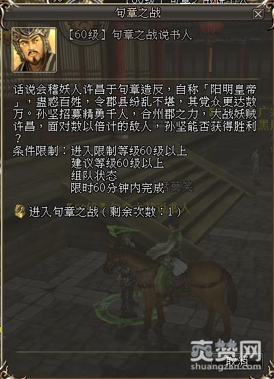 在句章之战副本中玩家需要依次击败呂合、秦狼、许韶、许昌四个BOSS。击败四个BOSS除了可以掉落与副本等级相符的装备武器外,还能掉落神铁、精钢、朱冠灵血、伯乐秘籍、长枪兵转职令、剑兵转职令、女弓兵转职令等稀有道具。句章之战在新版本中也新增了各职业的初级技能书掉落。