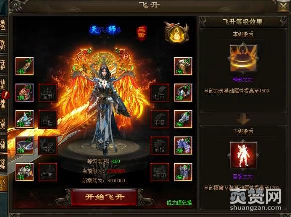 飞升5级:器灵装备基础属性提高至300% (激活后战力飞跃,这个应该算是提升最大,所以飞升快速先升到5阶)
