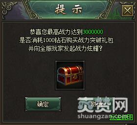 战力炫耀需花费钻石,玩家可选择进行炫耀或者放弃炫耀,每次炫耀,角色可立即领取与小小钻石等价值的礼包奖励。战力区间300-400万徐1000钻石、500-700万需2000钻石、800-900万需3000钻石、1000万以上需要5000钻石。
