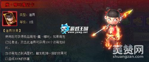 可用户激活萌宠-魔·哪吒,若是已激活该萌宠,双击该道具可获得100个萌宠碎片。萌宠碎片可提升萌宠星级,当魔·哪吒达到满星时,触发乾坤一掷的效果可以造成300%的伤害。