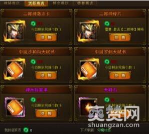 提供游戏内进阶,强化,提升战力的一些道具出售,每隔一段时间由系统刷新格子内的道具,购买需要花费荣誉值。