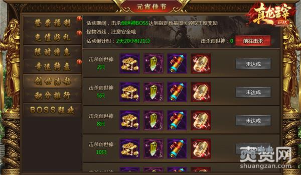 激情打boss,疯狂掉红装!在活动期间BOSS复活时间减半(跨服BOSS除外),活动期间击杀创世神达到指定只数即可领取丰厚奖励!