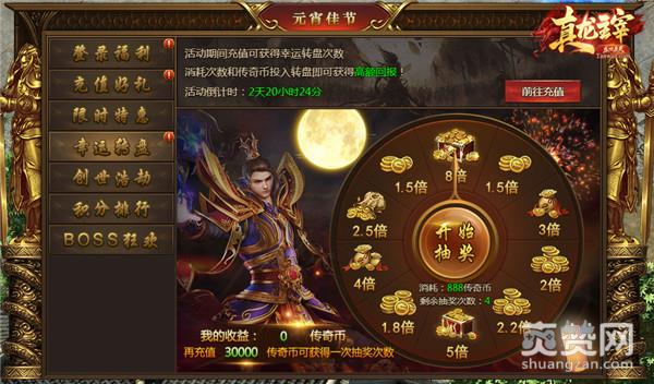 元宵福利转盘,转出你的精彩!活动期间充值可活动转盘次数,消耗转盘次数和传奇币即可转动转盘,并获得抽取倍数x消耗数量的传奇币奖励!