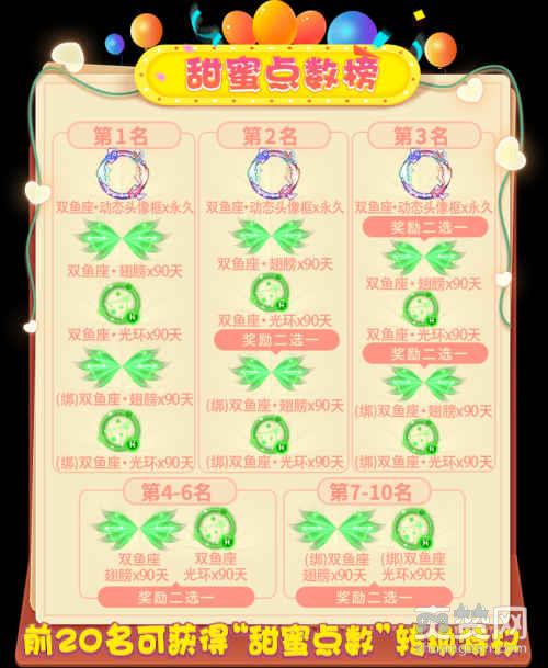 活动结束后,累计获得“甜蜜点数”最多的前二十位玩家,将获得“双鱼座”特别嘉奖和“甜蜜点数”转换特权