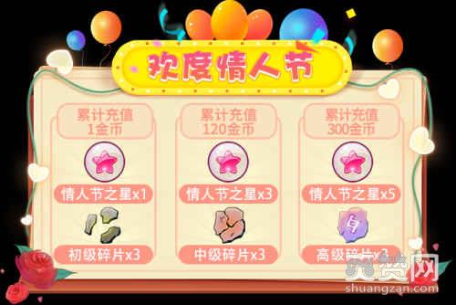 活动期间,通过充值获得金币,领取丰厚奖励并点亮“情人节之星”!活动结束后,根据全服玩家累计点亮的“情人节之星”数量开放奖励,所有玩家可根据自己点亮的“情人节之星”数量领奖!