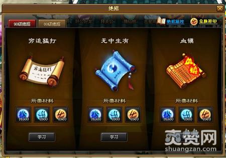 学技能需要获得符印,而符印可以扫荡指定的副本获得,也可以通过喜从天降系统获得的道具“仙令”兑换获得。80级绝招有强攻、排山倒海、回旋击。90级绝招有穷追猛打、无中生有、血镇。三个90级绝招学习所需材料为黄色符印X10、蓝色符印X30、青色符印X30。只要活得这些符印就可获得相应绝招。
